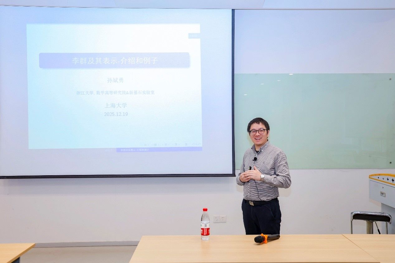 12月19日,由理学院数学系主办的中国数学会上海大学数学科普教育基地专家科普报告、数学大师讲坛第十七讲以线上线下同步的形式开讲。线下会场设在校本部 GJ303室,线上通过腾讯会议同步进行。本次邀请的主讲嘉宾是中国科学院院士、浙江大学数学高等研究院教授孙斌勇。孙斌勇院士为师生作了题为《李群及其表示-介绍和例子》的学术报告。校内外师生近100人线上线下共同聆听了报告。