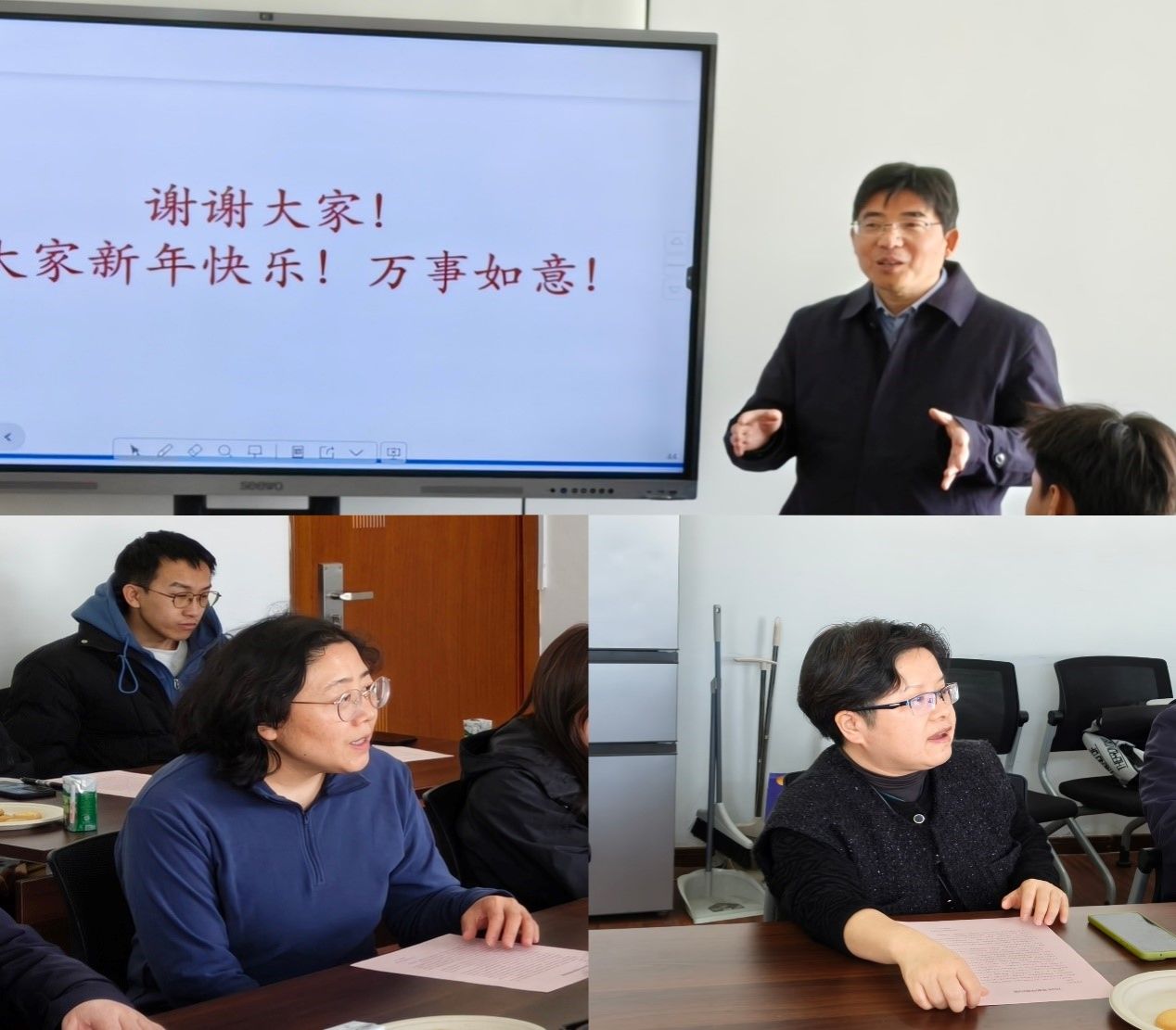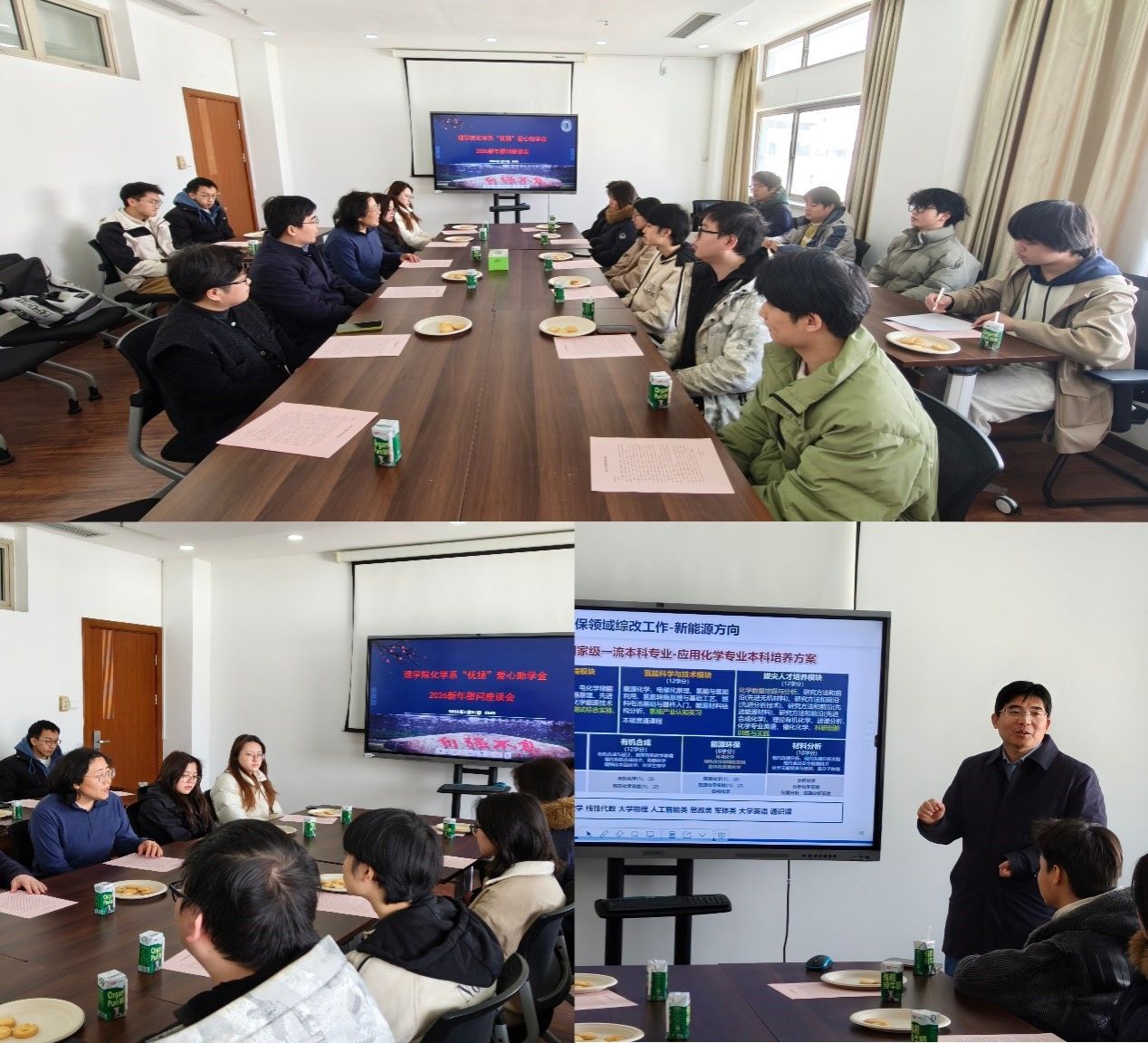 1月20日,理学院化学系“爱心优扬”助学金新年慰问座谈会在E608会议室温馨举行。化学学科党总支书记邢菲菲、化学系主任李健、化学系本科教学副主任洪玲与学生代表齐聚一堂,围绕2025年学科发展情况及同学们的学习生活展开交流,为新一年的人才培养工作注入温暖力量。