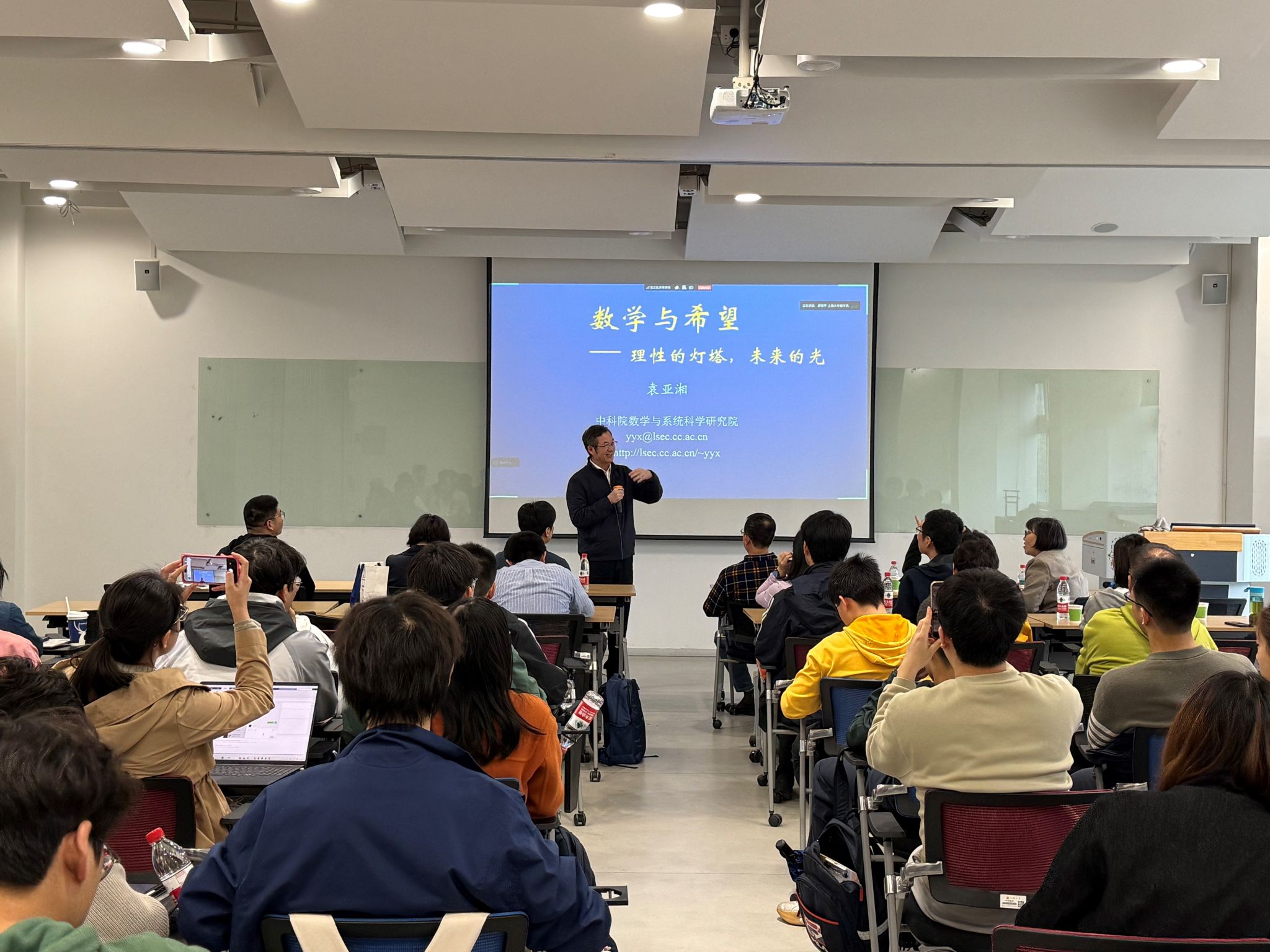 本次报告中,袁亚湘院士以《数学与希望》为题,结合2026年国际数学节“数学与希望”的主题,系统阐述了数学与希望之间的深刻内在关联,明确指出数学不仅是支撑科学技术发展的坚实基石,更是滋养人类理性信念、指引前行方向的重要力量。袁院士从联合国教科文组织确立该主题的时代背景切入,结合中国2025年发行的《数学之美》邮票所彰显的社会对数学学科的广泛认同,生动引出报告核心命题:希望并非盲目乐观的憧憬,而是基于理性分析的坚定信念;而数学,正是人类掌控不确定性、将希望转化为可实现路径的核心工具。