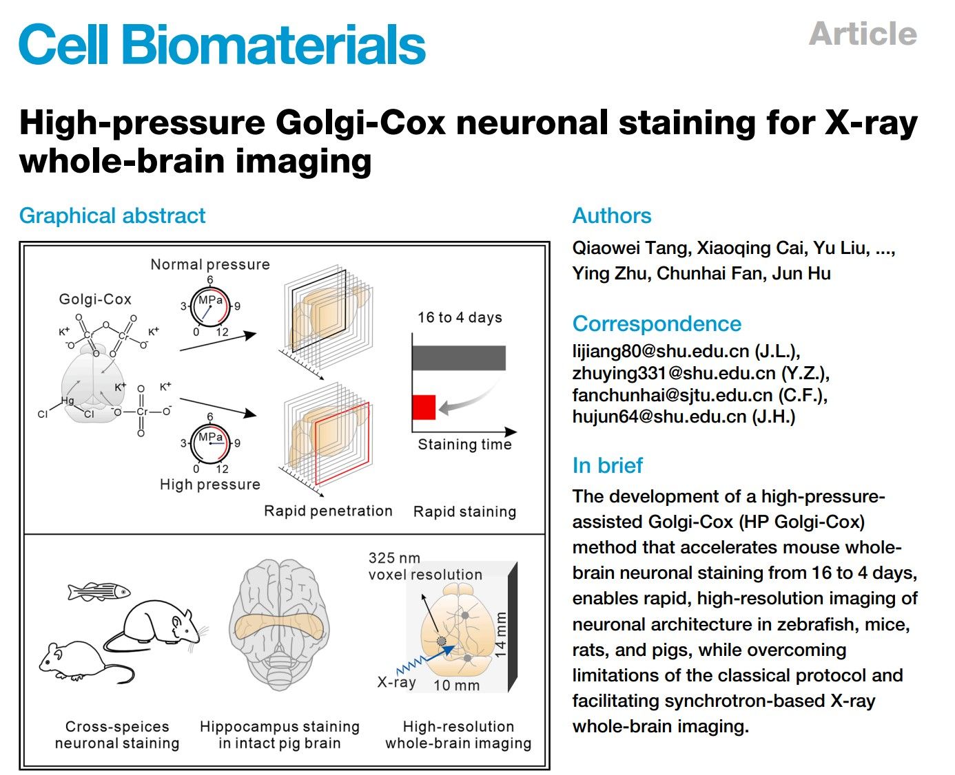 近期,上海大学理学院材料生物学研究所胡钧研究员,诸颖研究员,李江研究员联合上海交通大学樊春海院士团队,研发了一种高压辅助Golgi-Cox(HP Golgi-Cox)方法,将小鼠全脑神经元染色时间从 16 天缩短至 4 天,实现了对斑马鱼、小鼠、大鼠和猪等多种动物神经元结构的快速高分辨率X射线成像。该研究成果近期发表在Cell系列期刊《细胞·生物材料》(Cell Biomaterials)杂志上。