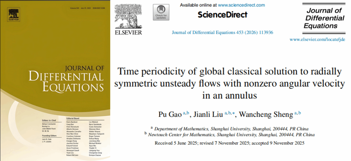近日,理学院数学系博士研究生高普在国际知名期刊《Journal of Differential Equations》(中科院数学一区Q1期刊)发表题为“Time periodicity of global classical solution to radially symmetric unsteady flows with nonzero angular velocity in an annulus”的研究成果。这是数学学科偏微分方程黎曼双曲团队今年在《Journal of Mathematical Physics》发表亮点文章后又一次取得重要进展。该成果系统研究了环形区域带非零角速度的可压缩欧拉方程组的稳定性与时间周期行为,所考虑的模型在航空航天推进、天体物理旋转气体团以及工程环形管道设计等方面具有重要物理背景。