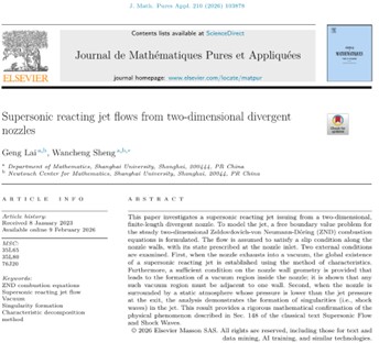 近期,理学院数学系盛万成教授“黎曼双曲”(非线性偏微分方程)团队在纯粹与应用数学顶级期刊Journal de Mathématiques Pures et Appliquées上发表了题为“Supersonic reacting jet flows from two-dimensional divergent nozzles”(https://doi.org/10.1016/j.matpur.2026.103878)的重要成果。该论文由理学院数学系赖耕教授和盛万成教授共同完成。