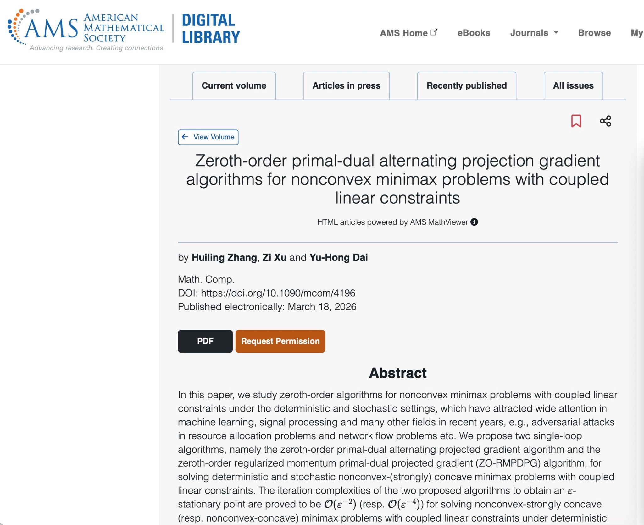 近日,理学院数学系徐姿教授与中国科学院张慧灵博士、戴彧虹院士合作,在美国数学学会期刊《Mathematics of Computation》在线发表题为 “Zeroth-Order Primal-Dual Alternating Projection Gradient Algorithms for Nonconvex Minimax Problems with Coupled Linear Constraints” 的重要研究论文。该论文以徐姿教授为唯一通讯作者,上海大学为通讯单位。