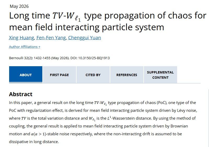 近日,理学院数学系阳芬芬副教授与天津大学副教授黄兴、英国Swansea大学Chenggui Yuan教授合作,在国际概率论著名期刊《Bernoulli》上发表题为“Long time TV-W_{\ell_1} type propagation of chaos for mean field interacting particle system”的学术论文。该论文以阳芬芬为唯一通讯作者,上海大学为通讯单位。