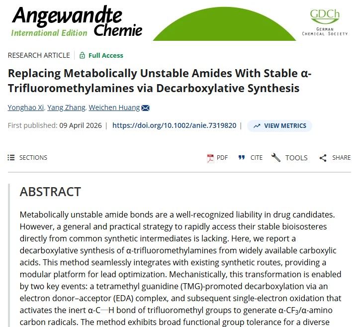 近日,理学院化学系黄伟臣教授团队在重要生物电子等排体α-三氟甲基胺的合成领域取得重要进展,相关研究结果以“Replacing Metabolically Unstable Amides With Stable α-Trifluoromethylamines via Decarboxylative Synthesis”为题发表于国际化学顶级学术期刊《Angewandte Chemie International Edition》。该论文第一作者为我校硕士研究生西永浩,上海大学为第一通讯作者单位。该研究工作由上海大学独立完成,黄伟臣教授为唯一通讯作者。